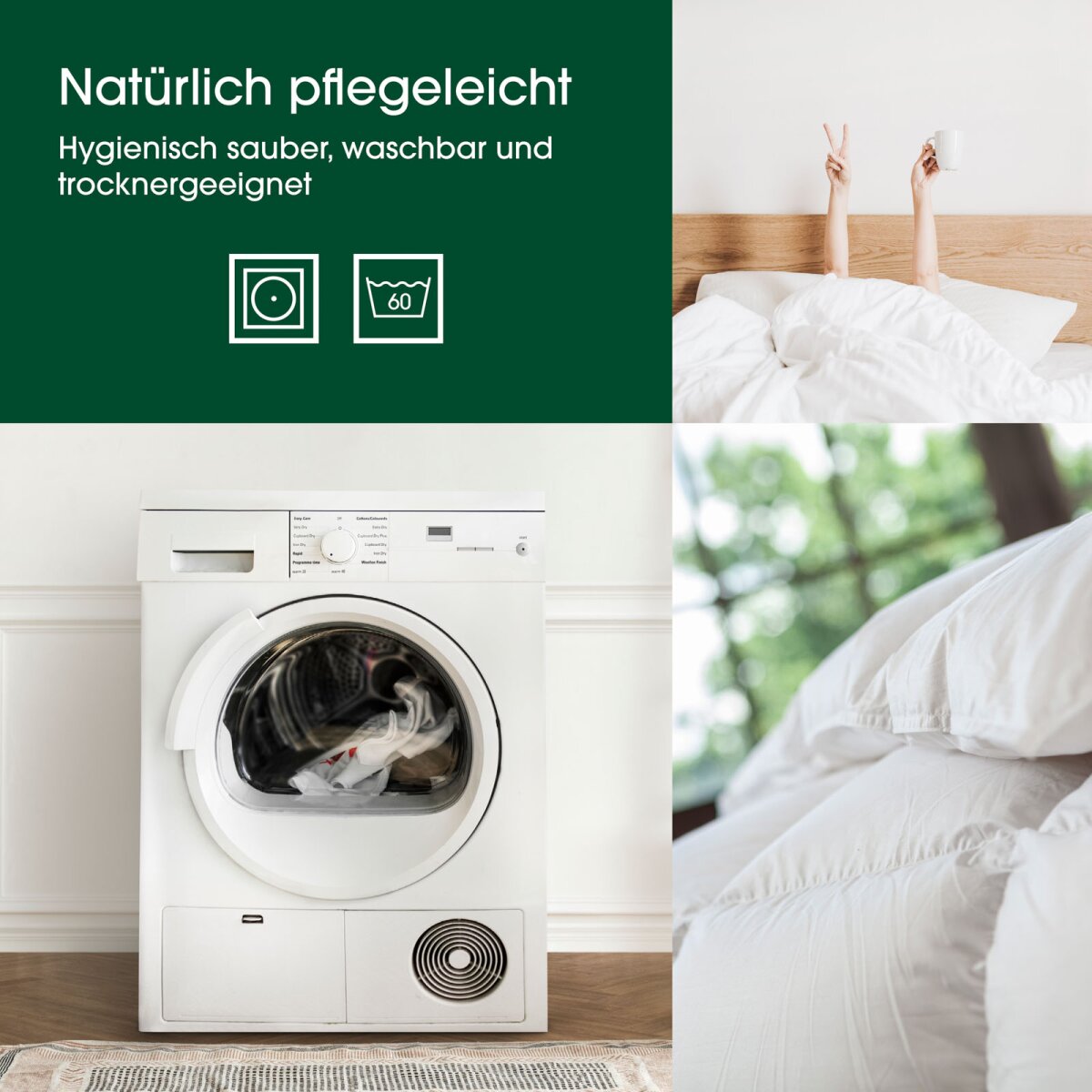 Bei Bedarf: Das Waschen Ihres Daunenbettes ist unter Beachtung der Pflegehinweise möglich. Generell empfehlen wir die Reinigung durch einen Fachbetrieb, da nicht jede haushaltsübliche Maschine für die Wäsche einer Daunendecke geeignet ist.