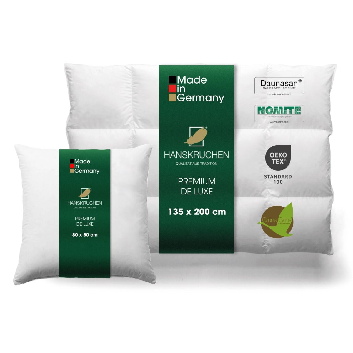 Gönnen Sie sich erholsamen Schlaf mit dem Premium de Luxe KomfortBundle: eine medium Daunendecke in der Größe 135x200 cm und ein ergonomisches Dreikammerkissen 80x80 cm, perfekt aufeinander abgestimmt.