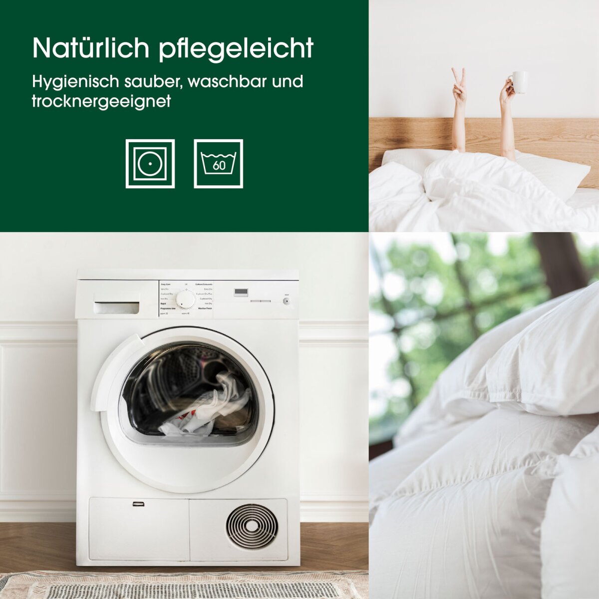 Innenkammer aus 70 % Federn und 30 % Luftzellenstäbchen für stabile Stützkraft, Außenkammern mit 90 % Daunen und 10 % Federn für weichen Komfort. Der glatte 100er Daunenperkal-Bezug sorgt für ein sanftes Hautgefühl.