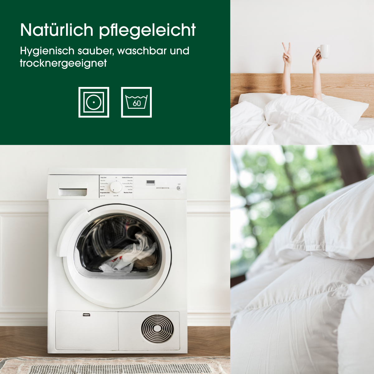 Luxuriöser Bezug – Der feine Daunenperkal-Bezug aus 100 % Baumwolle in strahlendem Weiß mit eleganter Biese fühlt sich besonders sanft auf der Haut an und sorgt für ein angenehmes Schlafgefühl.