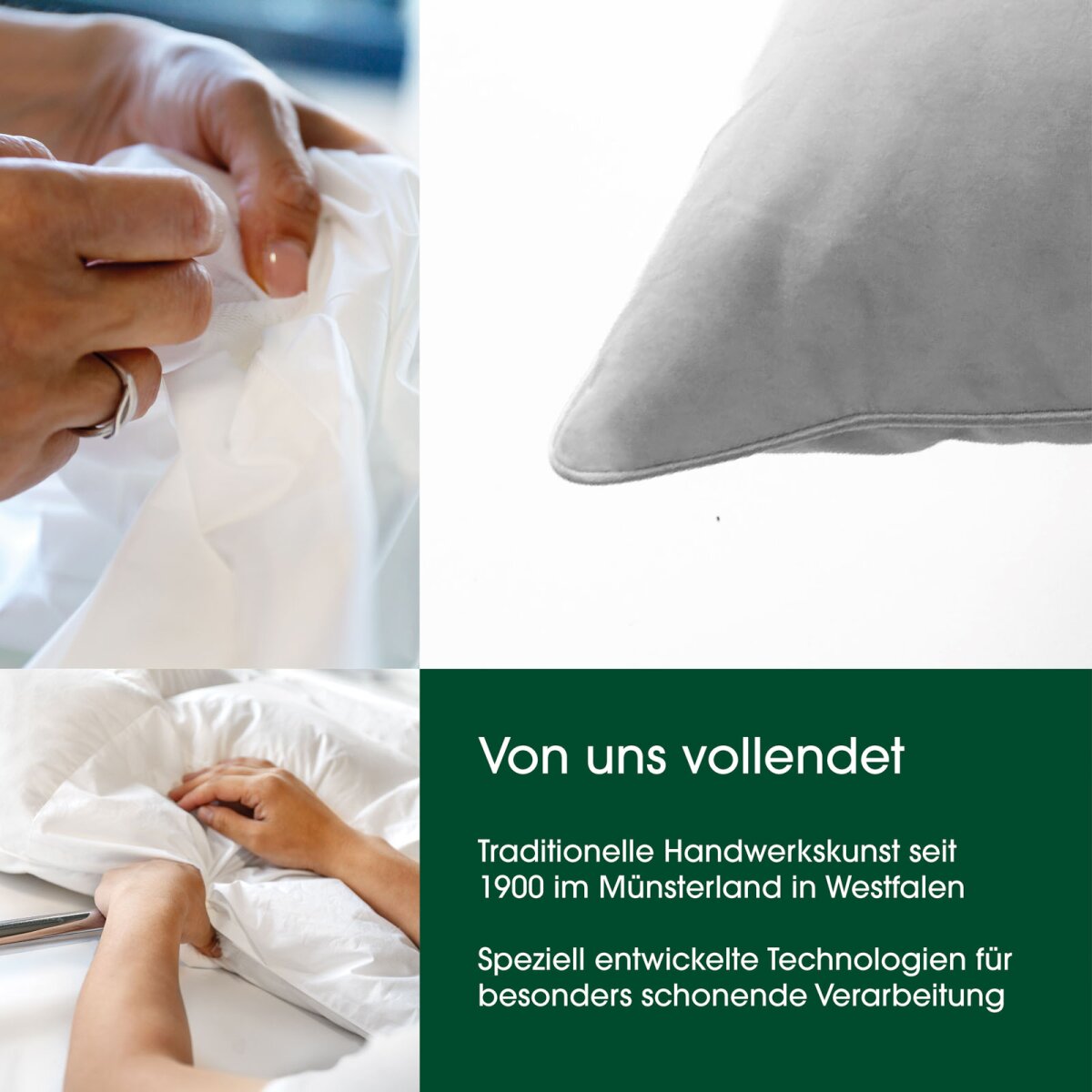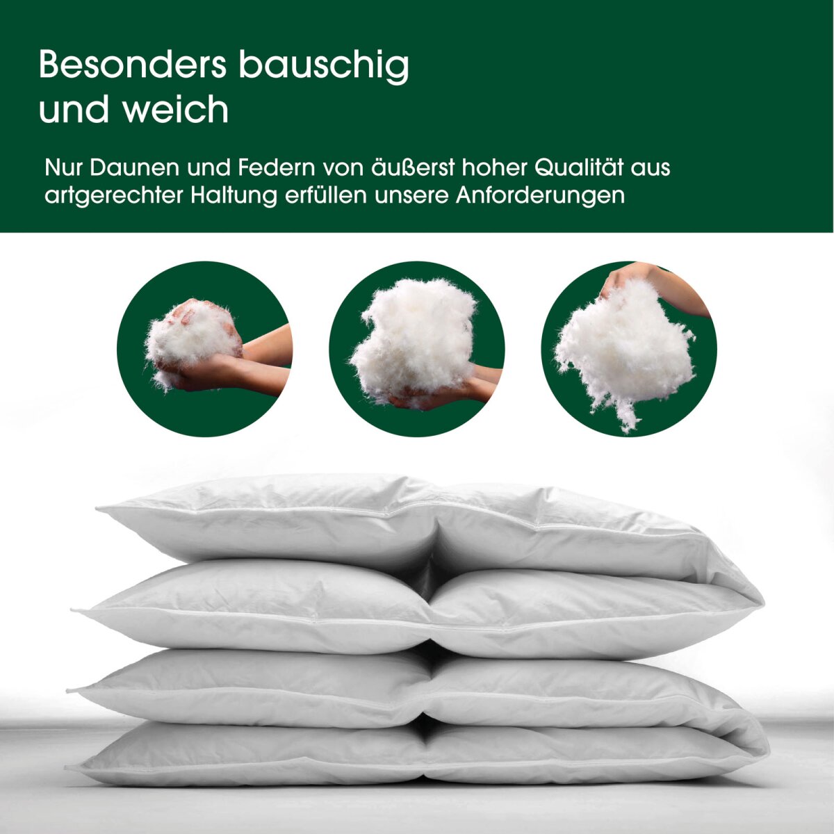 Innenkammer aus 70 % Federn und 30 % Luftzellenstäbchen für stabile Stützkraft, Außenkammern mit 90 % Daunen und 10 % Federn für weichen Komfort. Der glatte 100er Daunenperkal-Bezug vermittelt ein besonders sanftes Hautgefühl.