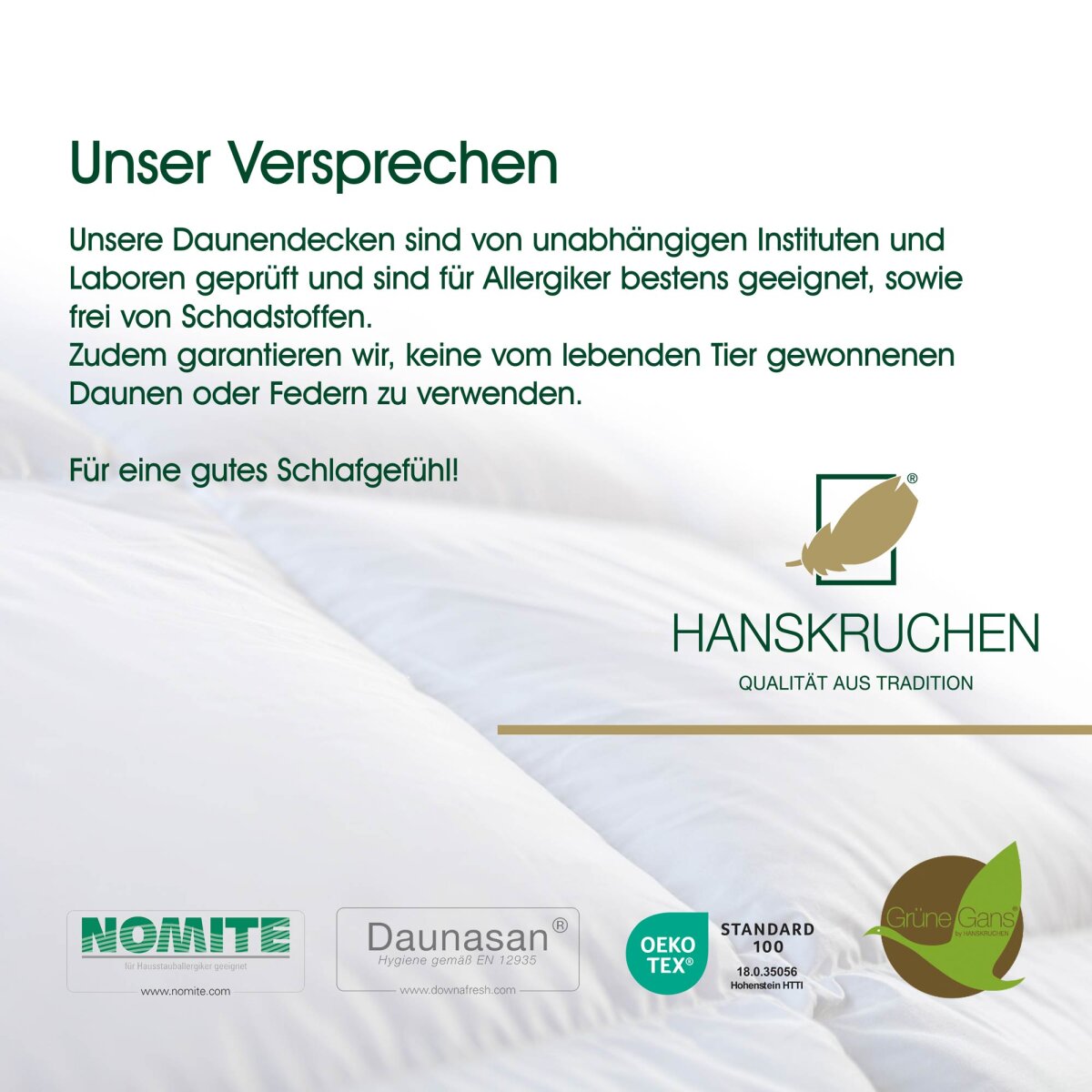 Die HANSKRUCHEN Dauneneinziehdecke Sommer in der Größe 135x200 cm bietet optimalen Komfort für warme Nächte. Mit einer Füllung von 150 Gramm hochwertiger Münsterländer Daunen sorgt sie für ein leichtes und luftiges Schlafgefühl. Diese Decke ist ideal für eine Person und bietet eine hervorragende Wärmeisolierung, die durch die erstklassige Verarbeitung und das feine Gewebe unterstützt wird. Die weiche Struktur der Decke sorgt für ein luxuriöses und gemütliches Schlaferlebnis, das hohen Komfort und erholsame Nächte garantiert.